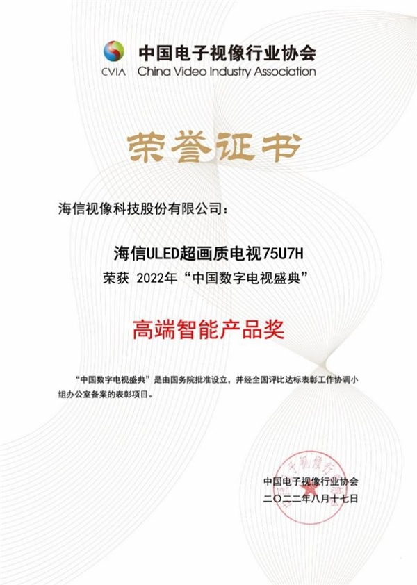 8月17日,在中國電子視像行業(yè)協(xié)會主辦“2022中國數(shù)字電視盛典”頒獎大會上,海信75U7H榮獲“高端智能產(chǎn)品獎”,以表彰海信U7在高端市場起到的重要引領(lǐng)作用。