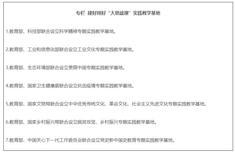 10.建好用好實踐教學基地。教育部會同有關部門,利用現有基地(場館),分專題設立一批“大思政課”實踐教學基地。發(fā)揮好教育部高校思政課教師研學基地的實踐教學功能。各地教育部門要結合實際,積極建設“大思政課”實踐教學基地。大中小學要主動對接各級各類實踐教學基地,開發(fā)現場教學專題,開展實踐教學。有條件的學??膳c有關基地建立長效合作機制,加強研究和資源開發(fā)。各基地要積極創(chuàng)造條件,與各地教育部門、學校建立有效工作機制,協(xié)同完成好實踐教學任務。