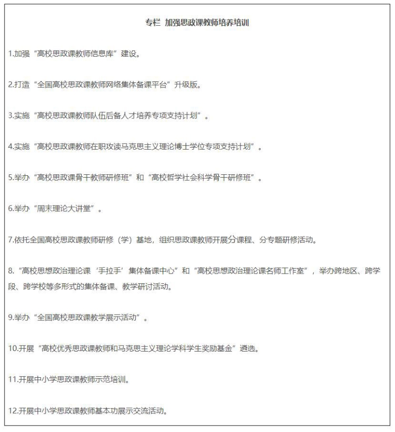 14.建設專兼結合的師資隊伍。各地各校嚴格按照要求配備建強高校專職思政課教師、輔導員隊伍,提高中小學專職思政課教師比例,實行思政課特聘教授、兼職教師制度,積極聘請黨政領導、科學家、老同志、先進模范等擔任思政課兼職教師。深入實施馬克思主義學院院長(書記)培養(yǎng)工程,通過集中培養(yǎng)培訓、委托重大項目、加強實踐鍛煉、開展國際國內訪學等方式,培養(yǎng)一批青年馬克思主義理論家。