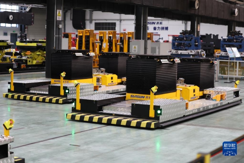 這是在沈陽新松機器人自動化股份有限公司拍攝的雙舉升合裝移動機器人。新華社記者 潘昱龍 攝