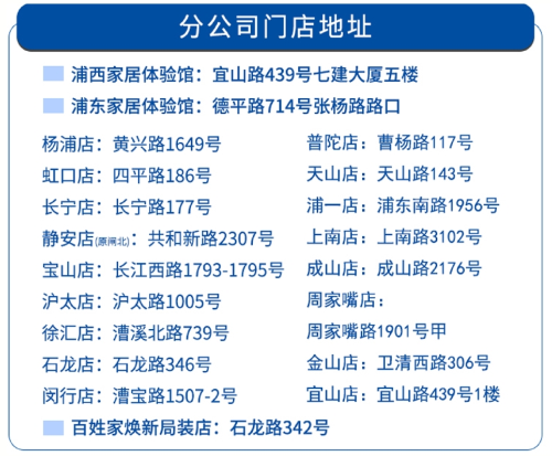本次“百姓冰爽家裝節(jié)”前所未有,屆時,百姓遍布滬上各區(qū)的二十家門店將采取全城聯(lián)動形式,業(yè)主可就近至百姓各大門店咨詢活動詳情,體驗家門口的靠譜裝修,共赴家裝盛筵。