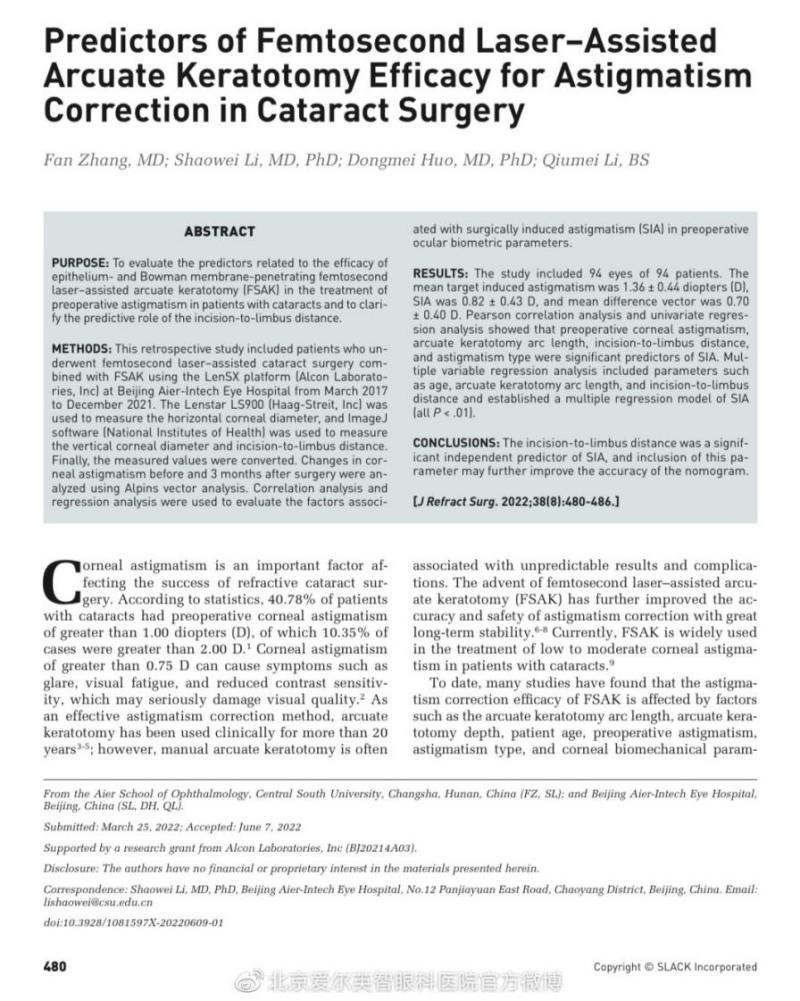 近日,北京愛(ài)爾英智眼科醫(yī)院李紹偉教授團(tuán)隊(duì)在期刊Journal of Refractive Surgery(中科院2區(qū)SCI期刊,影響因子3.2550)發(fā)表論文“Predictors of Femtosecond Laser-Assisted Arcuate Keratotomy Efficacy for Astigmatism Correvtion in Cataract Surgery(飛秒激光輔助弧形角膜切開術(shù)治療白內(nèi)障術(shù)前散光療效的預(yù)測(cè)因素)”。截至目前,李紹偉教授團(tuán)隊(duì)在國(guó)內(nèi)外發(fā)表論文140余篇,主編參編專著12部,承擔(dān)國(guó)家省級(jí)部級(jí)等課題20余項(xiàng),并獲各級(jí)獎(jiǎng)勵(lì)13項(xiàng)。