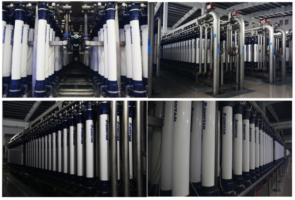 廣州北部水廠超濾膜車間設(shè)置40個膜堆,每個膜堆設(shè)272支超濾膜柱。單膜柱有效膜面積40平方米,總過濾面積43.52萬平方米,相當(dāng)于60個國際標(biāo)準(zhǔn)足球場。得益于中信環(huán)境技術(shù)先進的膜系統(tǒng)集成技術(shù),得以在5000平方米裝置區(qū)內(nèi),集成了10,880支膜原件,每萬噸處理能力膜區(qū)用地僅約80平方米。