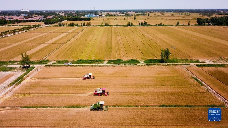 2022年6月7日,在山東省惠民縣桑落墅鎮(zhèn),農(nóng)民駕駛農(nóng)機(jī)收獲小麥(無(wú)人機(jī)照片)。新華社記者 郭緒雷 攝