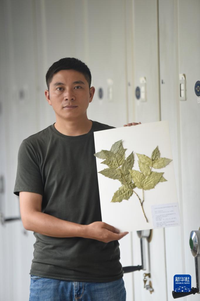胡君展示采集的尖齒衛(wèi)矛標(biāo)本(8月17日攝)。