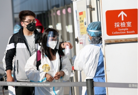臺(tái)灣地區(qū)自8月22日起調(diào)整入境總量人數(shù),從每周4萬(wàn)調(diào)升為5萬(wàn)人次。圖為剛下飛機(jī)的旅客正在排隊(duì)采檢。(圖/來(lái)源:臺(tái)灣“中時(shí)新聞網(wǎng)”)