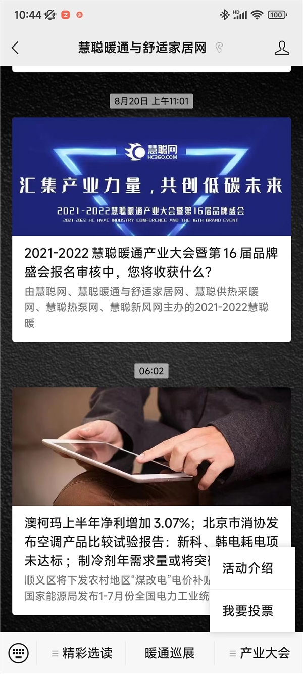 1.在微信中搜索【慧聰暖通與舒適家居網(wǎng)】、【慧聰熱泵網(wǎng)】、【慧聰供熱采暖網(wǎng)】、【慧聰新風(fēng)網(wǎng)】(任意其一),并關(guān)注。點(diǎn)擊菜單欄選擇【產(chǎn)業(yè)大會(huì)】-【我要投票】