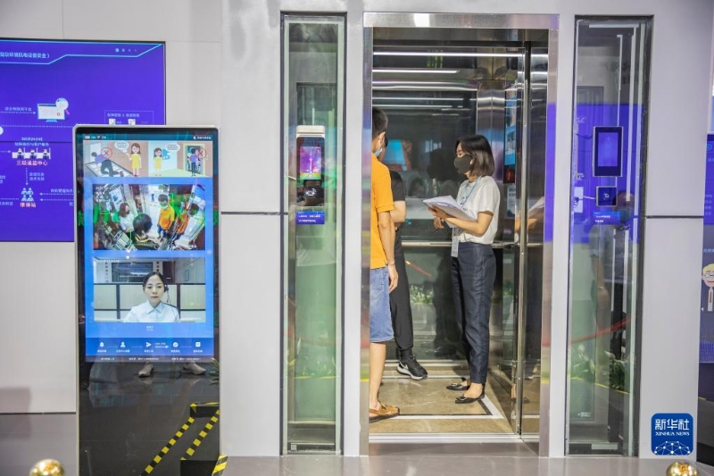 8月21日,在2022智博會重慶館內(nèi),工作人員帶媒體記者體驗智慧電梯的實時可視化救援服務(wù)。新華社記者 黃偉 攝