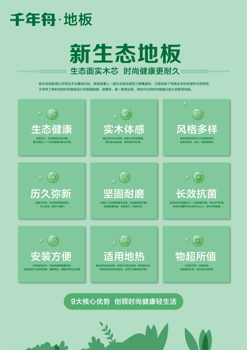 市面上眾多地板品牌都明確表示自然、環(huán)保、綠色、生態(tài)將是地板行業(yè)永遠(yuǎn)不變的潮流。自1999年成立以來,千年舟始終堅(jiān)持“為人民造一張好板”的初心,以“締造健康居家·引領(lǐng)品質(zhì)生活”為企業(yè)使命,堅(jiān)持“綠色設(shè)計(jì)、綠色智造、綠色產(chǎn)品、綠色供應(yīng)、綠色服務(wù)、綠色公益”的6綠品牌經(jīng)營理念。致力于健康環(huán)保產(chǎn)品的研發(fā)和生產(chǎn),重資投入科技研發(fā)和生態(tài)制造,追求卓越,服務(wù)社會(huì)。