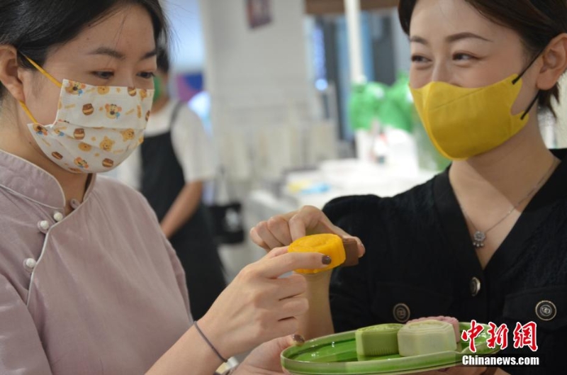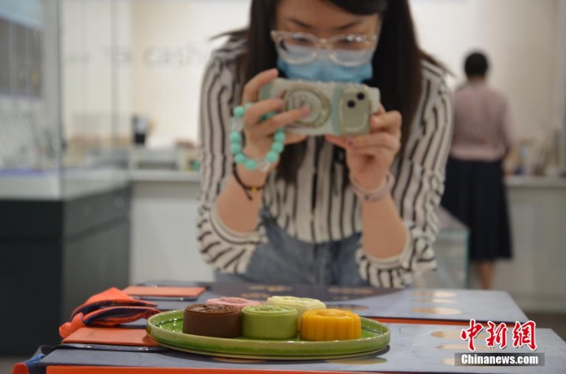 8月24日,蘭州市民正在甘肅省博物館內(nèi)相互分享不同類型的文創(chuàng)月餅。 李亞龍 攝