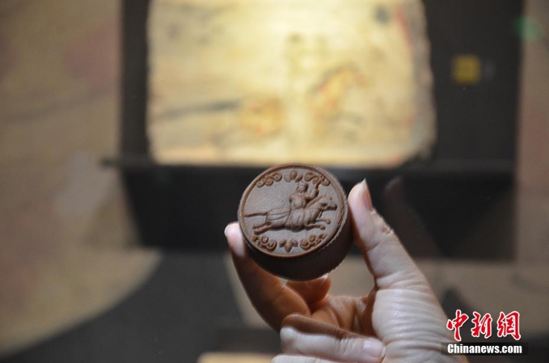 8月24日,甘肅省博物館內(nèi)文創(chuàng)月餅與相關文物同框展示。 李亞龍 攝