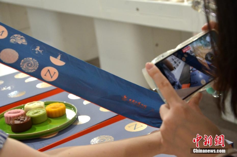 8月24日,甘肅省博物館內(nèi)參觀者正在拍攝文創(chuàng)月餅包裝盒上的手提絲帶,該手提絲帶也是一條文創(chuàng)絲巾。 李亞龍 攝