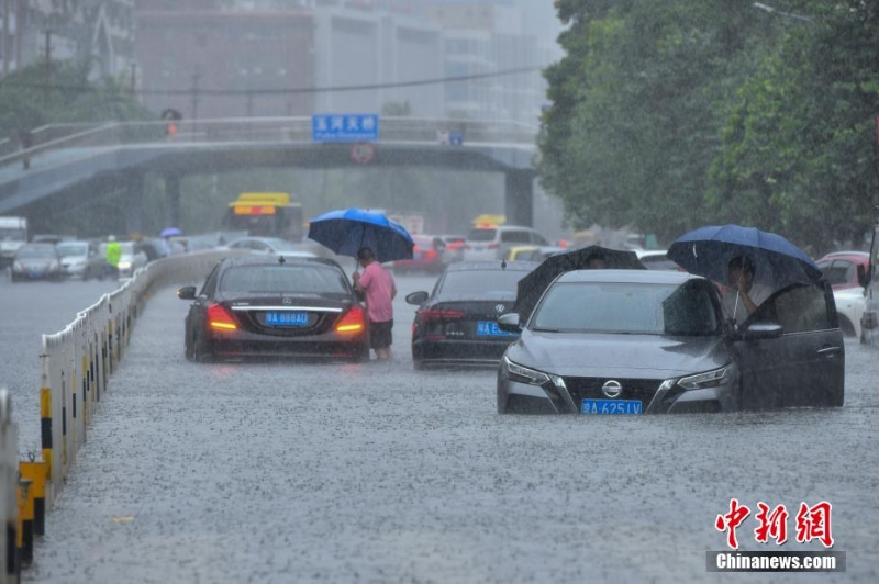 8月25日,今年第9號臺風(fēng)“馬鞍”在廣東電白沿海登陸。受其外圍云系影響,海南多地出現(xiàn)強(qiáng)風(fēng)雨天氣,??谑袣庀笈_25日13時01分變更暴雨橙色預(yù)警信號為暴雨紅色預(yù)警信號,??谑惺袇^(qū)近3小時累積雨量已達(dá)100毫米以上。圖為在??谑旋埲A路積水路段,多輛轎車在積水中拋錨。 駱云飛 攝