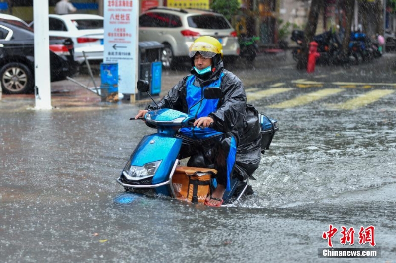 圖為??谑旋埲A路,一名外賣小哥通過積水路段。 駱云飛 攝