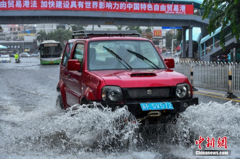 圖為在??谑旋埲A路,一輛越野車涉險通過積水路段。 駱云飛 攝