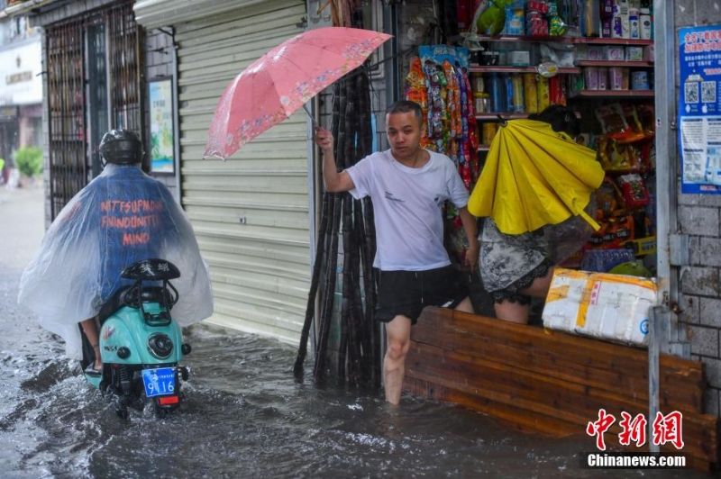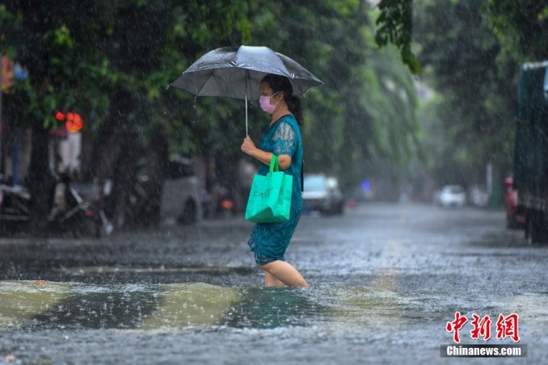 圖為??谑忻裨陲L(fēng)雨中蹚水出行。 駱云飛 攝