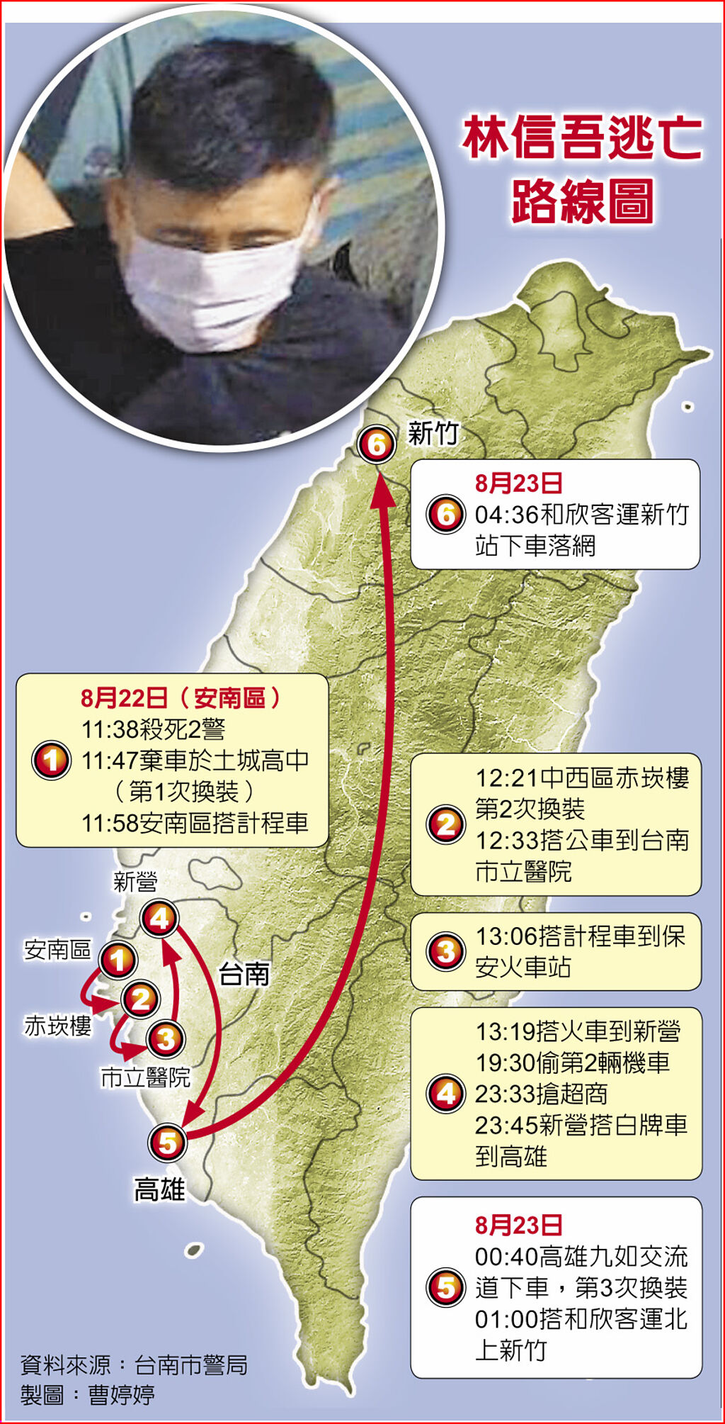 據(jù)臺灣“中時新聞網(wǎng)”報道,林信吾2019年因持玩具槍連續(xù)犯下超商強盜案,被判8年10月徒刑,2020年8月入獄,因是初犯,隔年轉入明德外役監(jiān),預計2028年出獄。林嫌本月13日返家探親,15日未依規(guī)定返監(jiān),脫逃1周后疑用盡盤纏,8月22日上午10時許在中西區(qū)赤崁街巷弄內偷走1輛機車,派出所警員凃明誠、曹瑞杰受理報案后追捕到安南區(qū)公墓,竟雙雙遭他殺害。