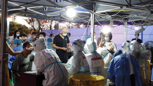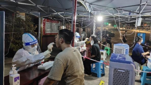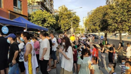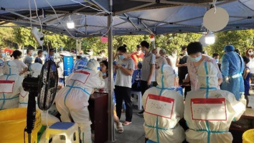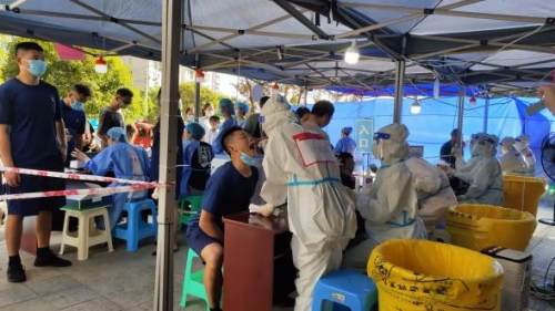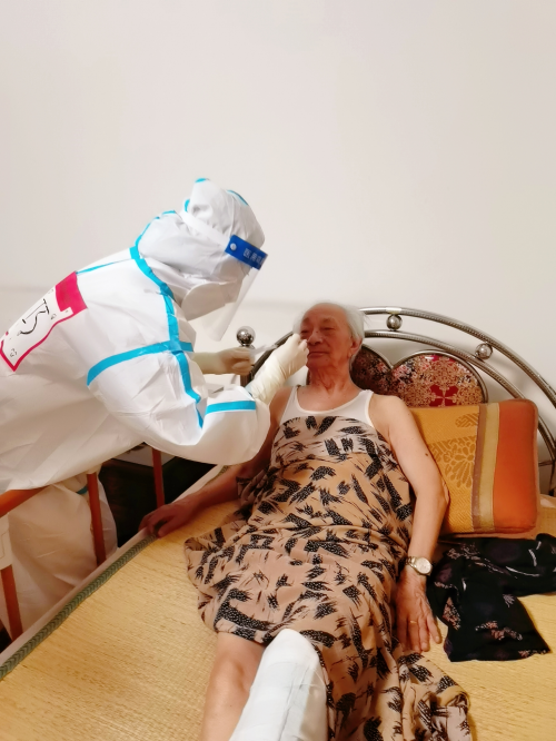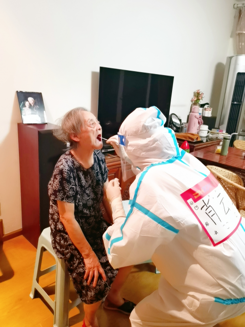 醫(yī)護(hù)人員在酷暑中穿著防護(hù)服,穿梭于各個(gè)小區(qū)各棟居民樓,入戶為老人、殘疾人士進(jìn)行核酸采樣。