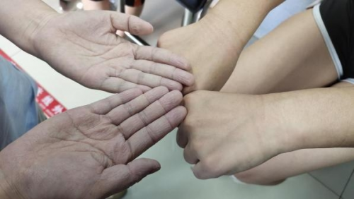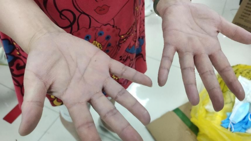 醫(yī)護(hù)人員在高溫酷暑下,被手套“泡白”的手。
