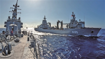“環(huán)太平洋-2022”軍演期間,澳大利亞海軍補(bǔ)給艦(右)對日本海上自衛(wèi)隊(duì)高波級驅(qū)逐艦進(jìn)行補(bǔ)給。