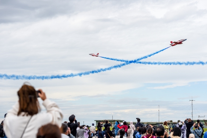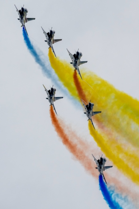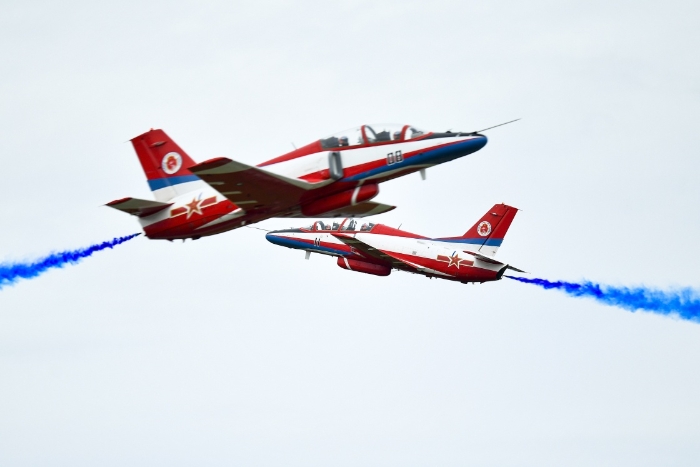 首先進(jìn)行飛行表演的是空軍航空大學(xué)“紅鷹”飛行表演隊(duì)。在為期5天航空開放活動(dòng)中,“紅鷹”飛行表演隊(duì)將呈現(xiàn)20套表演動(dòng)作,其中一箭穿心、八機(jī)斤斗,是他們的招牌動(dòng)作?!鞍艘弧憋w行表演隊(duì)6架殲-10飛機(jī)呈現(xiàn)了單機(jī)大仰角躍升,六機(jī)編隊(duì)斤斗、六機(jī)同步橫滾等動(dòng)作,不僅精彩震撼,同時(shí)也具備很高的實(shí)戰(zhàn)價(jià)值。