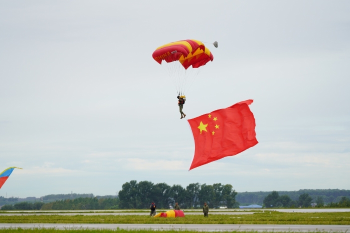 8月26日,在空軍航空開放活動(dòng)暨長(zhǎng)春航空展上,八一跳傘隊(duì)進(jìn)行跳傘表演。新華社發(fā)(時(shí)旭琛 攝)