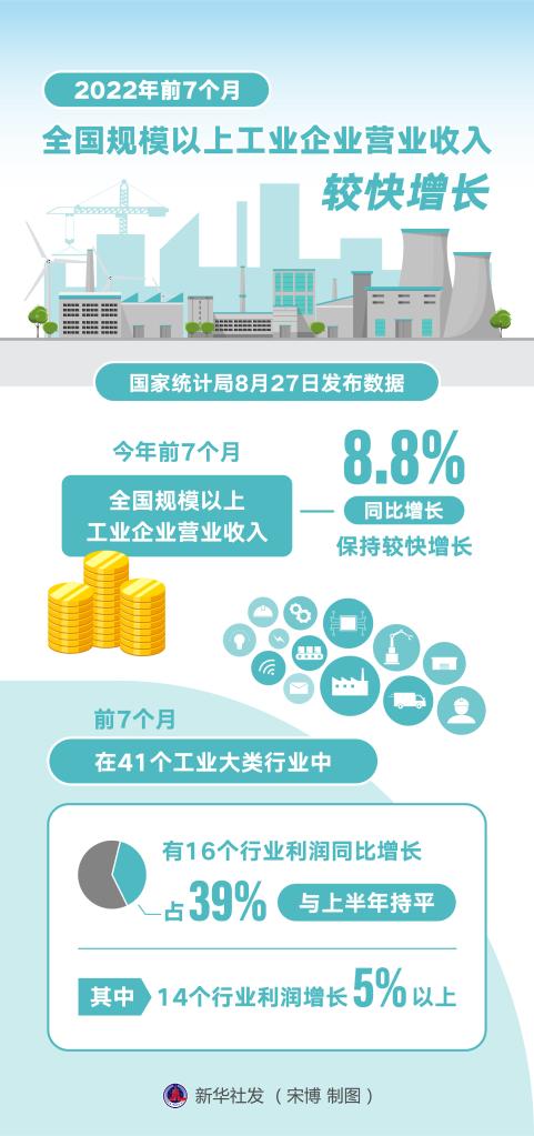 新華社北京8月27日電(記者魏玉坤)國家統(tǒng)計(jì)局27日發(fā)布數(shù)據(jù),今年前7個(gè)月,全國規(guī)模以上工業(yè)企業(yè)營業(yè)收入同比增長8.8%,保持較快增長;利潤同比下降1.1%,上半年為增長1%。
