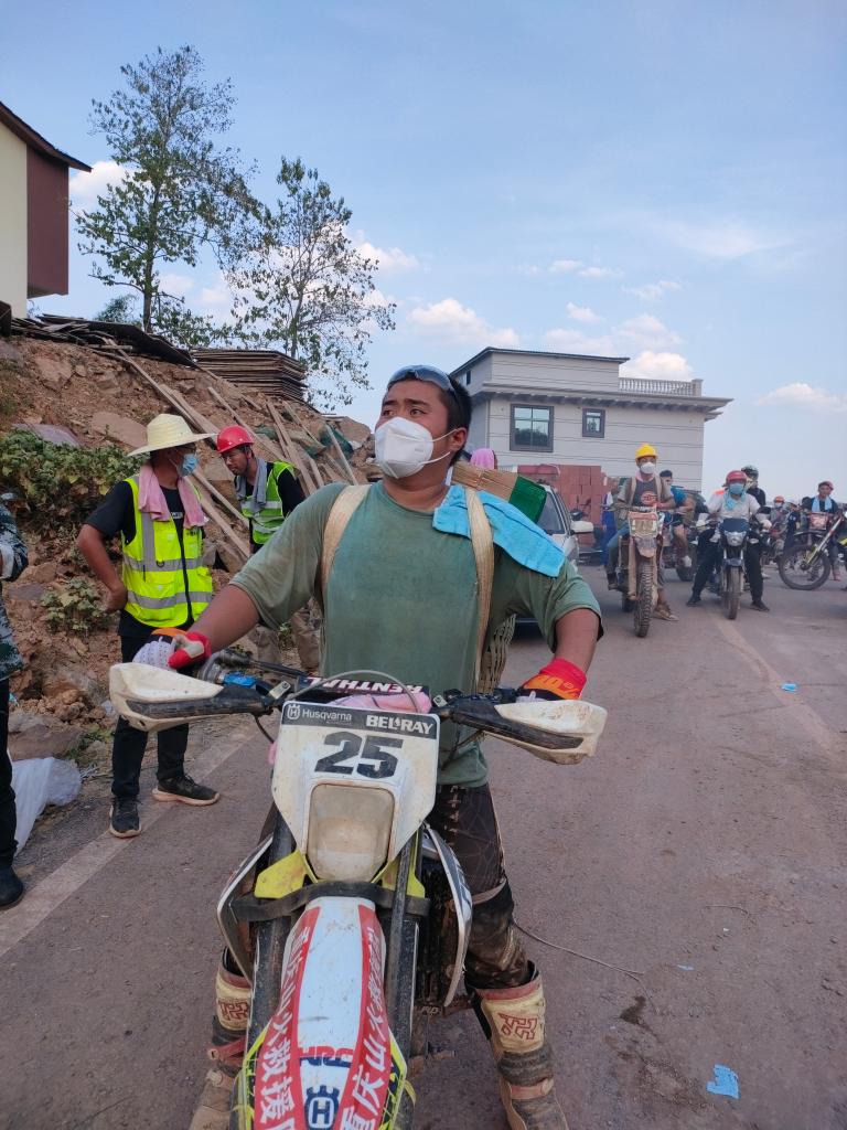 在山下救援物資轉運點,一輛輛摩托車隨時守候?!靶值?,上車!”記者跨上其中一輛摩托車。路上遇到沙地、陡坡,摩托車騎手扶住扶手,用腳發(fā)力往前蹬,褲腳、鞋子早已磨出了破洞、裂口。