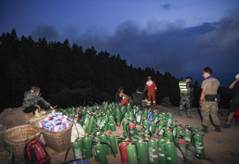 8月25日晚,在山頂隔離帶,救援人員和志愿者嚴(yán)陣以待。新華社記者 王全超 攝