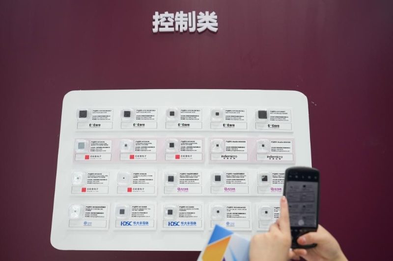 8月26日,一位參觀者在拍攝展出的車用芯片。當日,2022世界新能源汽車大會在北京、海南兩地以線上、線下相結合的方式召開。新華社記者 鞠煥宗 攝