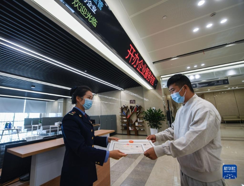 2020年11月10日,在浙江省杭州市臨安區(qū)行政服務(wù)中心的開辦企業(yè)服務(wù)專區(qū),蔣先生(右)從工作人員手中接過營業(yè)執(zhí)照。新華社記者 徐昱 攝