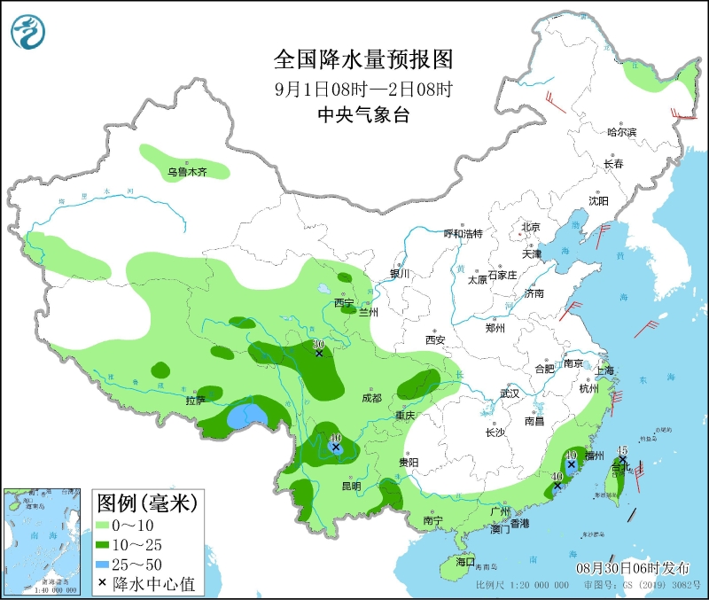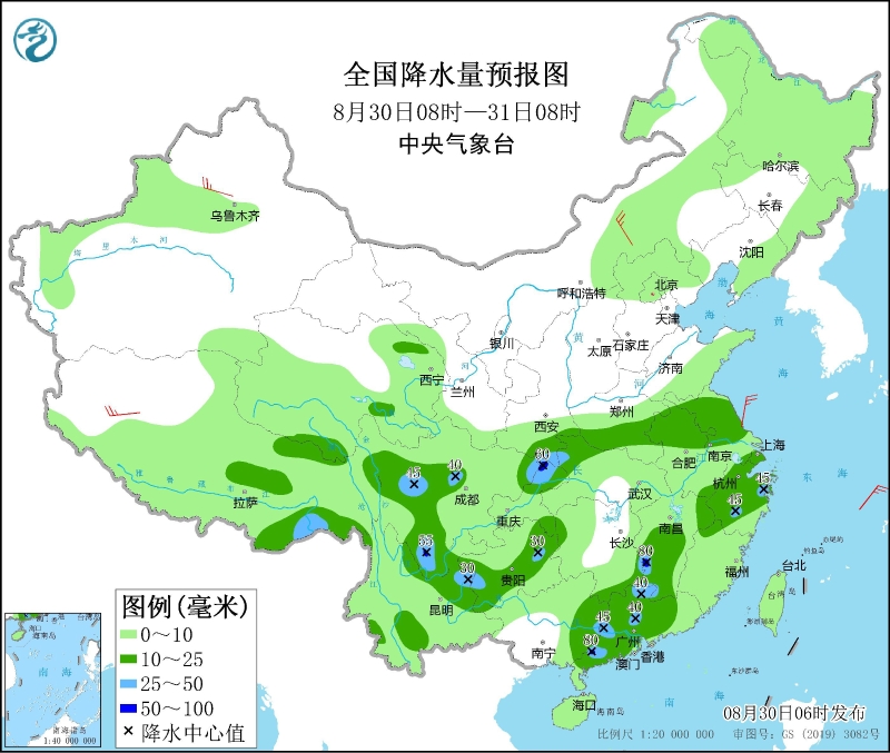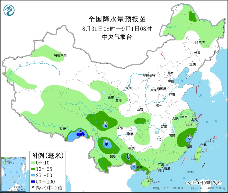 8月30日08時(shí)至31日08時(shí),青海南部、陜西南部、四川盆地東北部、川西高原中南部、重慶北部、湖北西部、河南南部、安徽北部、江蘇大部、云南東北部和南部、廣東中西部、江西南部、浙江大部等地部分地區(qū)有中到大雨,局地有暴雨(50~80毫米)。內(nèi)蒙古中東部、新疆沿天山地區(qū)、西藏西部等地部分地區(qū)有4~6級(jí)風(fēng)(見圖3)。