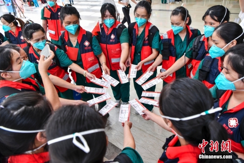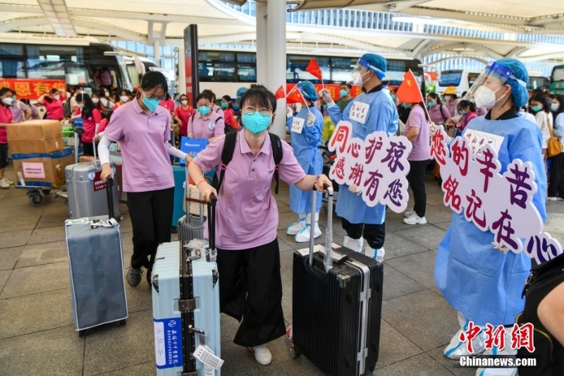 8月29日,福建、四川、山東等多地援瓊醫(yī)療隊近7000名隊員從??陉懤m(xù)返程。據(jù)了解,自8月初海南發(fā)生本土新冠肺炎疫情以來,共有來自全國20個省區(qū)市超2萬余名醫(yī)護(hù)人員馳援海南。當(dāng)前,海南疫情防控形勢穩(wěn)步向好,社會面感染者進(jìn)一步減少。自26日起,海南各地援瓊醫(yī)療隊員開始返程。圖為四川援瓊醫(yī)療隊隊員抵達(dá)??诿捞m國際機(jī)場。 中新社記者 駱云飛 攝