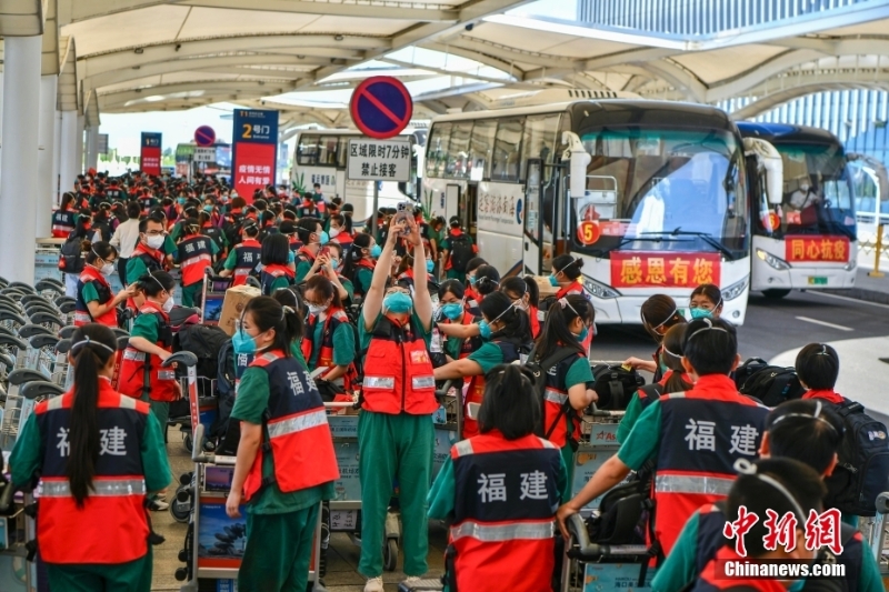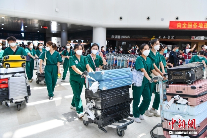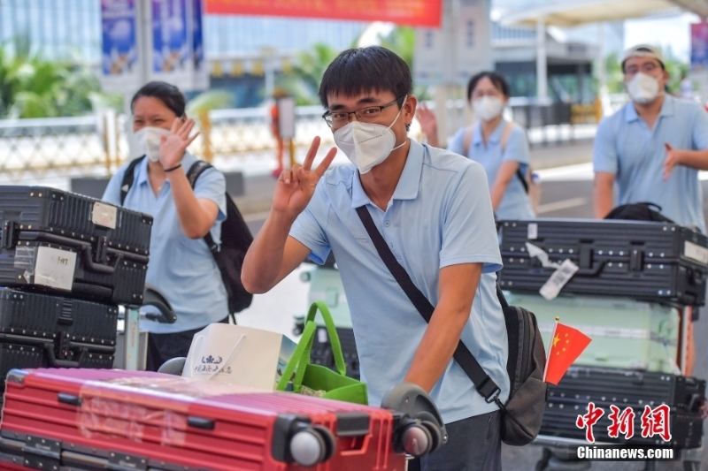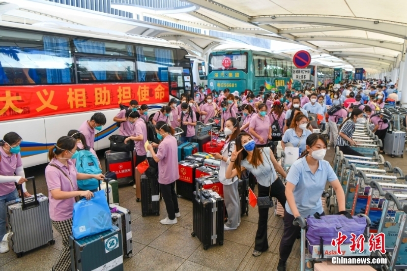 8月29日,福建、四川、山東等多地援瓊醫(yī)療隊近7000名隊員從??陉懤m(xù)返程。據(jù)了解,自8月初海南發(fā)生本土新冠肺炎疫情以來,共有來自全國20個省區(qū)市超2萬余名醫(yī)護(hù)人員馳援海南。當(dāng)前,海南疫情防控形勢穩(wěn)步向好,社會面感染者進(jìn)一步減少。自26日起,海南各地援瓊醫(yī)療隊員開始返程。圖為多個援瓊醫(yī)療隊陸續(xù)抵達(dá)海口美蘭國際機(jī)場。 中新社記者 駱云飛 攝
