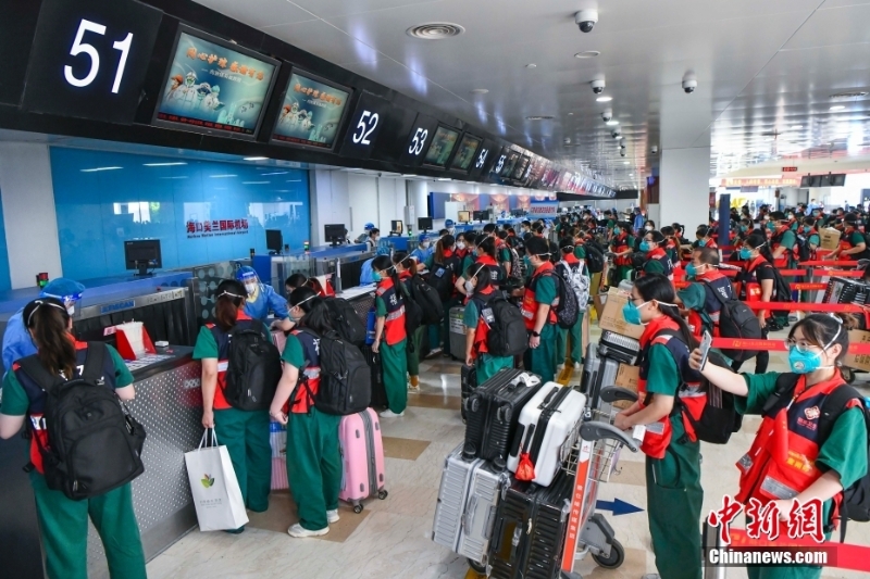 8月29日,福建、四川、山東等多地援瓊醫(yī)療隊近7000名隊員從??陉懤m(xù)返程。據(jù)了解,自8月初海南發(fā)生本土新冠肺炎疫情以來,共有來自全國20個省區(qū)市超2萬余名醫(yī)護(hù)人員馳援海南。當(dāng)前,海南疫情防控形勢穩(wěn)步向好,社會面感染者進(jìn)一步減少。自26日起,海南各地援瓊醫(yī)療隊員開始返程。圖為福建援瓊醫(yī)療隊隊員在海口美蘭國際機(jī)場T1航站樓排隊辦理值機(jī)。 中新社記者 駱云飛 攝