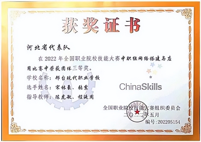 近日,2022年全國職業(yè)院校技能大賽(中職組)網(wǎng)絡(luò)搭建與應(yīng)用賽項在山東濱州舉辦,本項目比賽由來自全國35個省(市、區(qū))的67支代表隊參賽,經(jīng)過八個小時的激烈角逐,由陳虎敏,程延周老師指導(dǎo)的邢臺現(xiàn)代職業(yè)學(xué)校計算機網(wǎng)絡(luò)技術(shù)專業(yè)2007班張震、2008班宋林豪兩位同學(xué)榮獲團體三等獎。