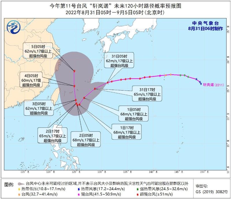 預計,“軒嵐諾”將以每小時30公里左右的速度向西偏南轉西南方向移動,9月1~2日將在琉球群島以東洋面停滯或回旋,爾后轉向北偏西方向移動,3日夜間移入東海東南部海面。未來4~5天“軒嵐諾”將維持超強臺風級的強度,最大強度可達17級以上(62~70米/秒)。