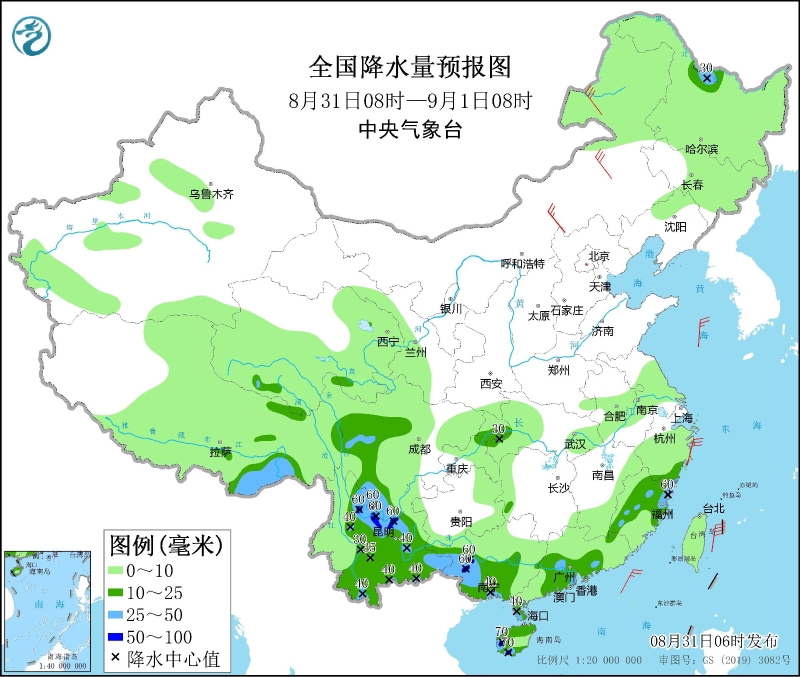 8月31日,川西高原、云南、華南南部等地的部分地區(qū)有中到大雨,局地暴雨,并伴有短時強降水、雷暴大風等強對流天氣。