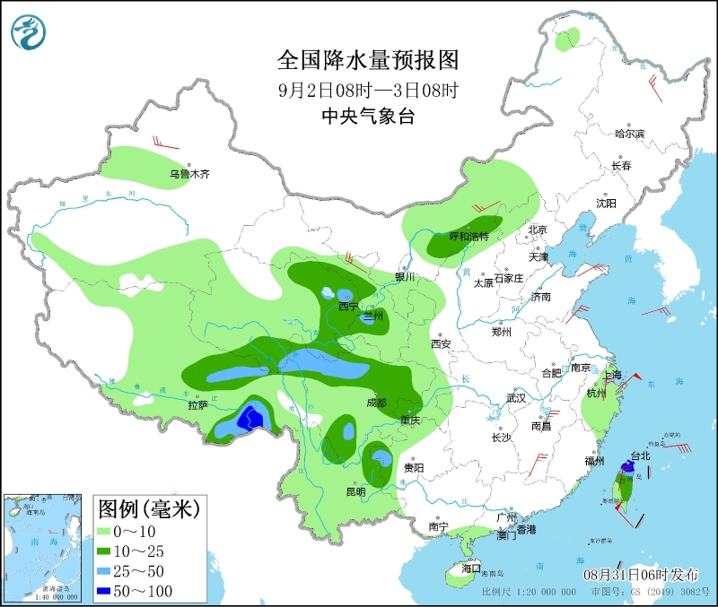 9月2日08時至3日08時,內蒙古河套地區(qū)、西藏北部和東部、青海東部和南部、甘肅河西和中部、四川北部和東南部、重慶南部、云南東北部、臺灣島大部等地部分地區(qū)有中到大雨,其中,西藏東南部、臺灣島北部等地部分地區(qū)有暴雨(50~90毫米)。內蒙古中部、黑龍江東北部、新疆沿天山地區(qū)、甘肅河西、山東半島、江西北部和南部、浙江北部、臺灣島中部等地部分地區(qū)有4~6級風(見圖4)。臺灣以東洋面將有12~13級、陣風14級的東北風。