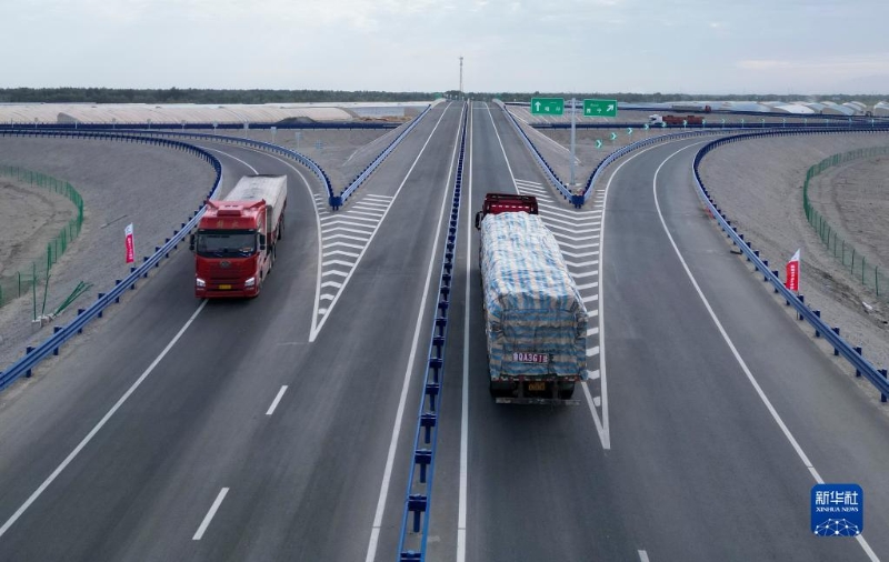 8月30日,車輛通過依若高速公路新疆若羌東出入口(無人機照片)。新華社發(fā)(阿迪力 攝)