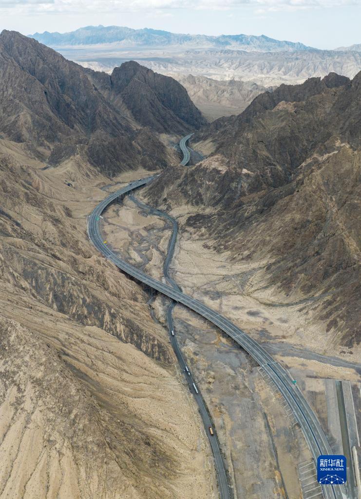 依若高速公路蜿蜒穿越新疆若羌縣山區(qū)(5月9日攝,無人機照片)。新華社發(fā)(王勇強 攝)