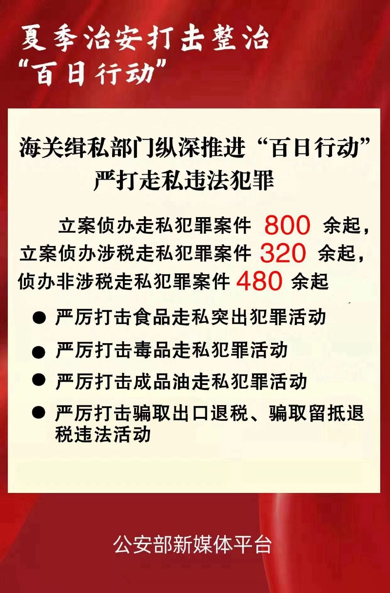 海關(guān)總署緝私局負責人表示,全國海關(guān)緝私部門將持續(xù)縱深推進“百日行動”,始終保持打擊走私高壓態(tài)勢,聯(lián)合協(xié)同各警種各部門深挖徹查走私關(guān)聯(lián)犯罪,以實實在在的打私成績切實維護國家安全和群眾利益。