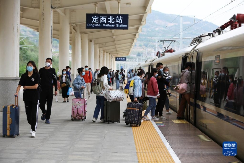 8月31日,旅客在寶蘭高鐵定西北站站臺(tái)上準(zhǔn)備乘車出行。