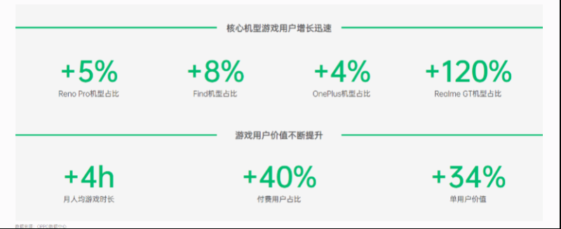 今年OPPO游戲大盤(pán)數(shù)據(jù)亮眼,增長(zhǎng)勢(shì)頭明顯。OPPO游戲的滲透率和付費(fèi)率持續(xù)增長(zhǎng),游戲流水環(huán)比保持10%以上增長(zhǎng),Reno、Find、一加、realme GT等核心機(jī)型游戲用戶數(shù)量增長(zhǎng)迅速,付費(fèi)用戶占比提升40%,用戶價(jià)值不斷攀升。