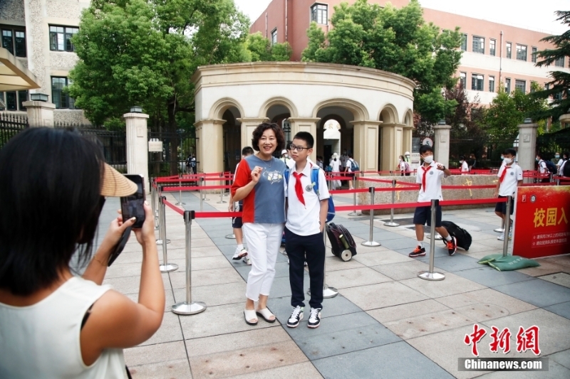 9月1日,上海,家長與學(xué)生在校門口合影留念。當(dāng)日,上海中小學(xué)、托幼機構(gòu)正式開學(xué)。 中新社記者 湯彥俊 攝