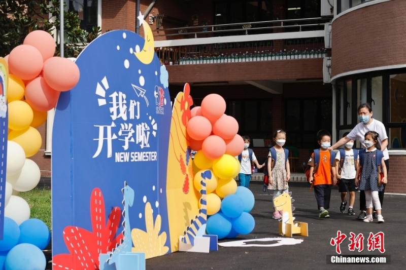 9月1日,在上海新世紀(jì)虹橋幼兒園,老師引導(dǎo)孩子有序進(jìn)入教室。當(dāng)日,上海中小學(xué)、托幼機構(gòu)正式開學(xué)。 中新社記者 殷立勤 攝