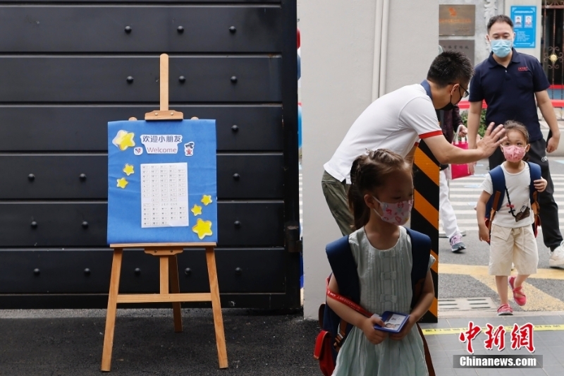 9月1日,在上海新世紀(jì)虹橋幼兒園,老師迎接孩子們的到來。當(dāng)日,上海中小學(xué)、托幼機構(gòu)正式開學(xué)。 中新社記者 殷立勤 攝