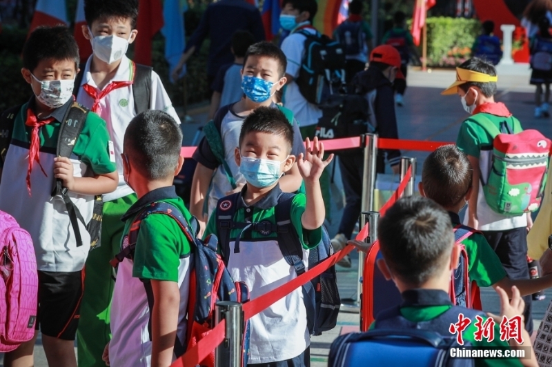 9月1日,北京市朝陽區(qū)芳草地國際學(xué)校,一名小學(xué)生走進(jìn)校園后向校門外的家長揮手。當(dāng)日,北京市中小學(xué)正式開學(xué)。 中新社記者 賈天勇 攝