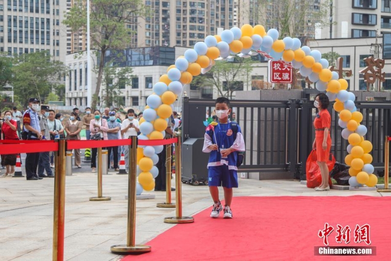 南昌市郵政路小學(xué)(天驥校區(qū)) ,一位一年級新生手持風(fēng)車走過紅毯進(jìn)入校園,校門外聚集著不少家長。劉力鑫 攝