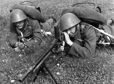 上圖:二戰(zhàn)時(shí)期,捷克斯洛伐克軍隊(duì)士兵使用捷克式輕機(jī)槍作戰(zhàn)。
